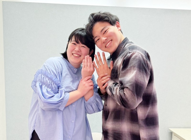 結婚指輪をお選びになる際には、Y様がお幸せそうな表情で、楽しそうに指輪選びをされていて、その隣でK様も隠やかな笑顔を浮かべられていました。お二人のやり取りからは、温かくほっこりとした空気感が伝わってきました。