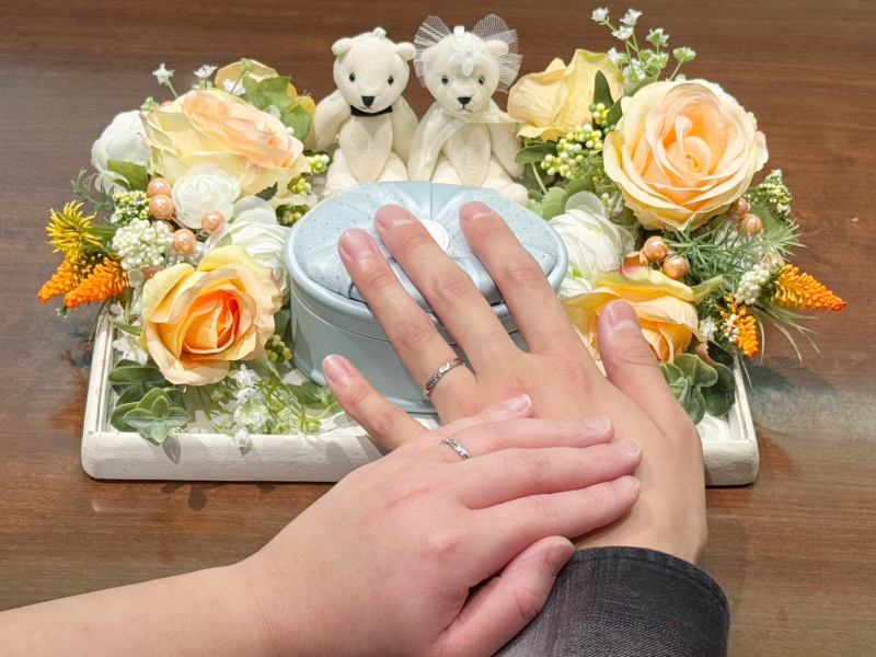 ご納品の際、新郎K様は「実際に自分の物として仕上がってきた指輪を着けたら、感動しました。(プロポーズから結婚指輪選び、そして納品まで)とても良い経験でした」とお話しくださいました。