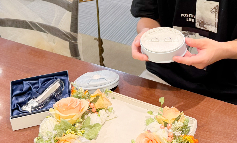 ディズニーがお好きな新婦K様のために、「喜んでくれる指輪を贈りたい」と、一つひとつ丁寧にご覧になりながら、真剣に選ばれていました。