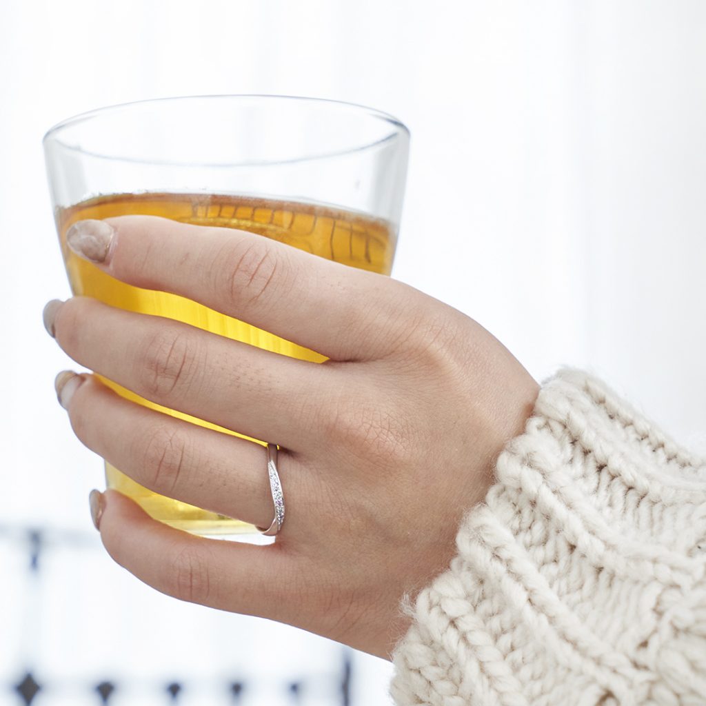 婚約指輪との重ね着けでもラインがなじみやすく、重ねたときに自然な一体感が出るのも魅力のひとつです。