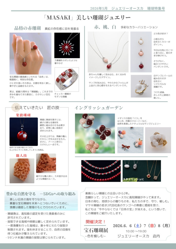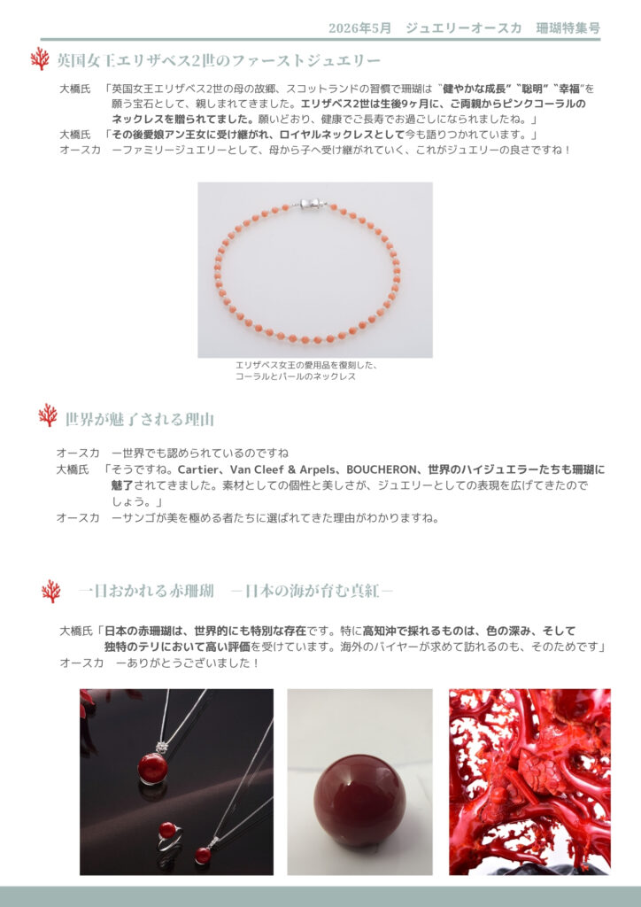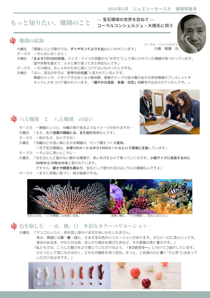 珊瑚の赤をまとう 「MASAKI」美しい珊瑚ジュエリー もっと知りたい、珊瑚のこと-宝石珊瑚の世界を訪ねて-コーラルコンシェルジュ大橋氏に伺う 日本が育む高知珊瑚を求めて 大須賀 睦美 「MASAKI珊瑚」訪問-宝石珊瑚の魅力を知るため、高知の産地を訪ねました- 大須賀 隆