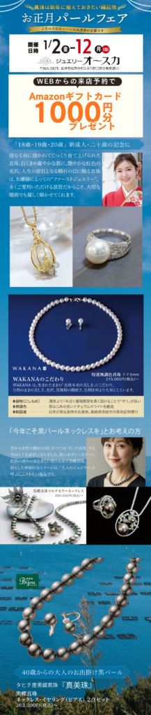 パール用お問い合わせフォーム ご来店予約は、お電話にてお問い合せいただくか、下記のメールフォームよりご連絡ください。 メール送信完了後、当サイトよりメールが届きます。 (携帯の場合、メールが受信できるよう、ドメインの受信許可設定をお願いいたします。) 当日のご来店を希望される場合、直接店舗へお電話ください。 0120-27-0887 下記のフォームよりご予約いただくと、アマゾンギフトカード1,000円分をご来店特典としてプレゼントしております。(数量限定) ご来店日時 * ご予約状況により少々お待たせする事がございます。 何卒、ご了承いただきますようお願い致します。 ご希望のお品 * アコヤ真珠黒蝶真珠ご自分用ギフト用リフォームその他(※複数選択可) お名前 * フリガナ * メールアドレス * ※ 携帯電話のメールアドレスをご利用の場合は、happy@jewelry-osuka.com からのメールが受信できるようにご設定ください。 ※確認のため2度入力してください。 電話番号 * ご住所 郵便番号 都道府県 —以下から選択してください—北海道青森県岩手県宮城県秋田県山形県福島県茨城県栃木県群馬県埼玉県千葉県東京都神奈川県新潟県富山県石川県福井県山梨県長野県岐阜県静岡県愛知県三重県滋賀県京都府大阪府兵庫県奈良県和歌山県鳥取県島根県岡山県広島県山口県徳島県香川県愛媛県高知県福岡県佐賀県長崎県熊本県大分県宮崎県鹿児島県沖縄県 市区町村 当店のことは何で知りましたか? Google検索Yahoo!検索GoogleマップInstagramYouTube雑誌広告ご紹介その他 ご質問・その他 できるだけ具体的にご記入ください。 個人情報保護方針* プライバシーポリシーに同意する
