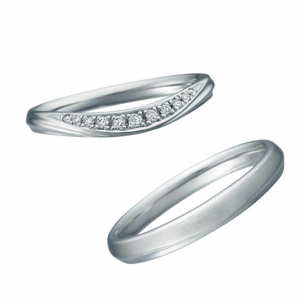 ・面が反るように切り返しデザインを入れることで、プラチナが煌めき美しく華やかな印象に。魔法が解ける前にお城から急ぎ足で階段を駆け下りるシンデレラの美しいドレスがひらめくように。