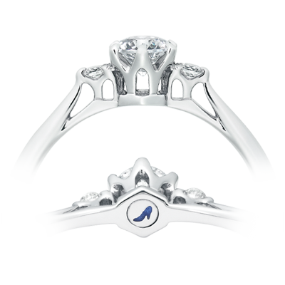 正面から見ると王道のシンプルデザイン、側面はシンデレラ城の美しい建築造形を取り入れました。柱が立っているかのような石座で、柱と柱の間のシルエットを模した透かし窓を。石座には6か所の透かし穴で全面から光を取り込み、0.3ctのダイヤモンドを輝かせます。
