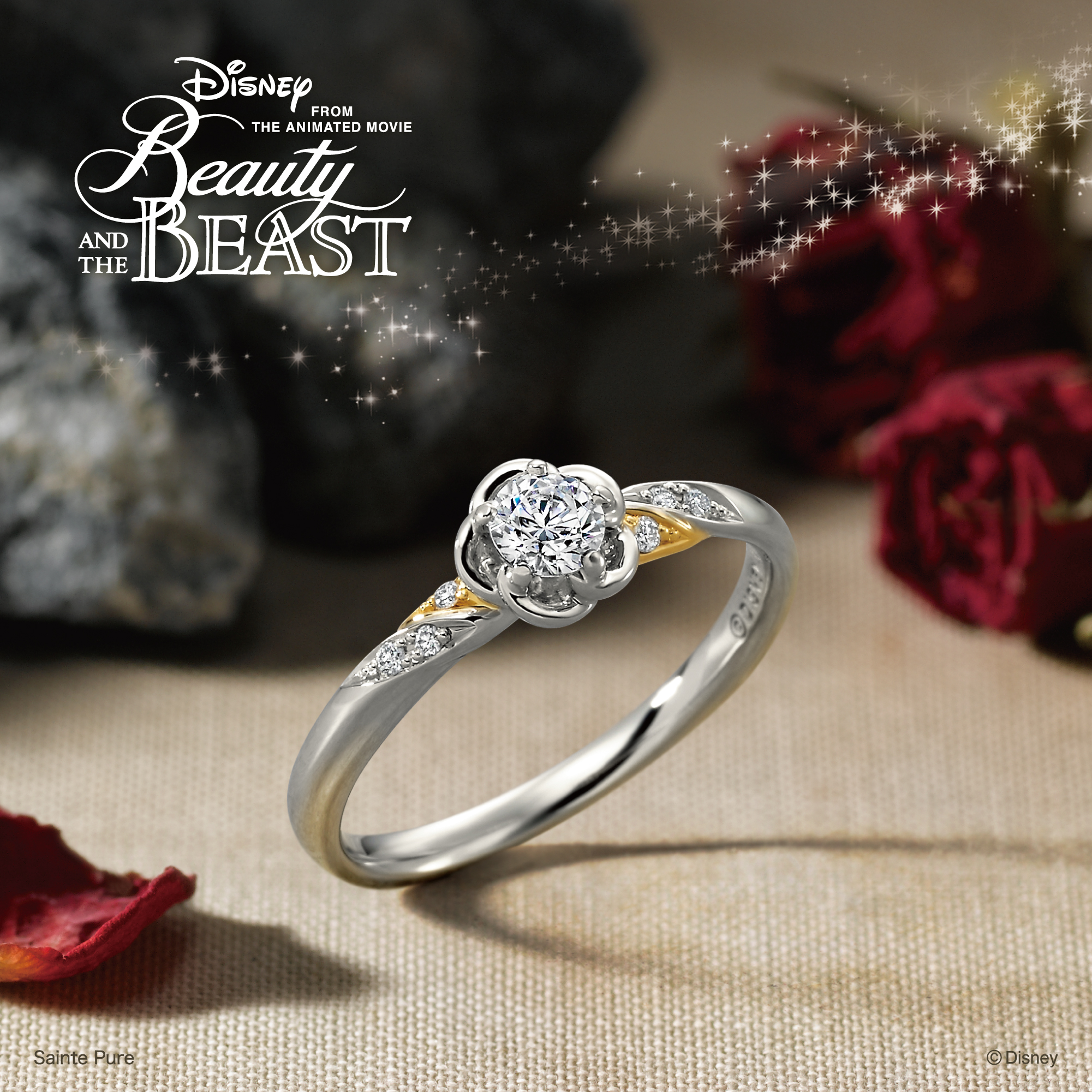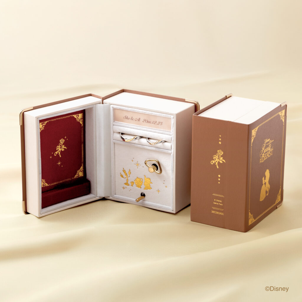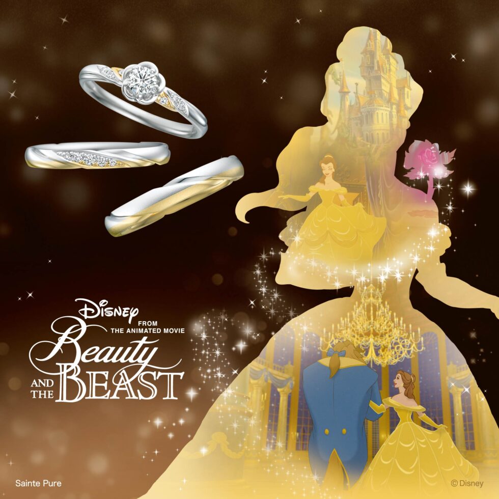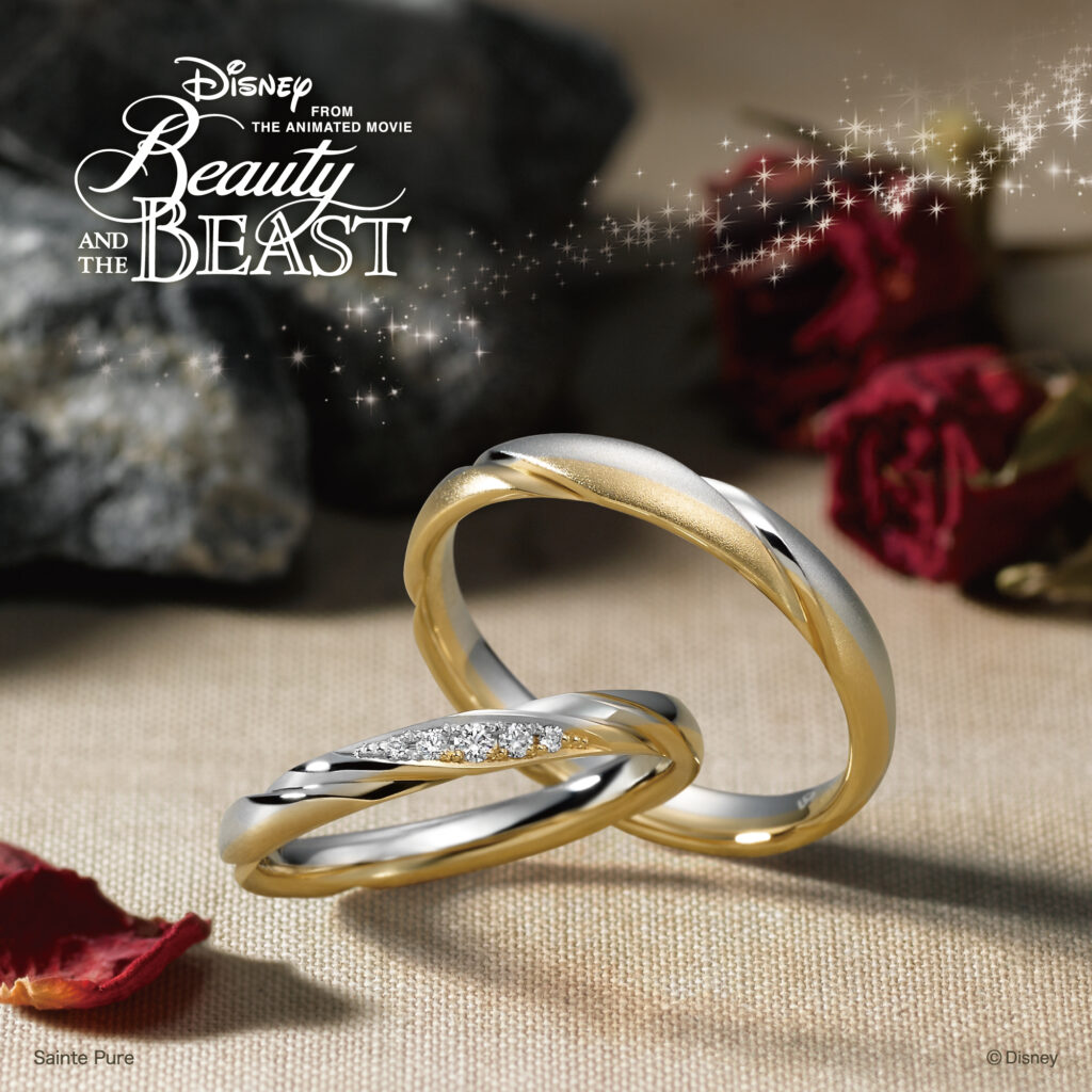 ベルを思わせるやわらかなイエローゴールドと、野獣の気高さを表現したプラチナ――ふたつの異なる素材がぴたりと重なるデザインは、まるで物語のように惹かれ合うふたりのよう。