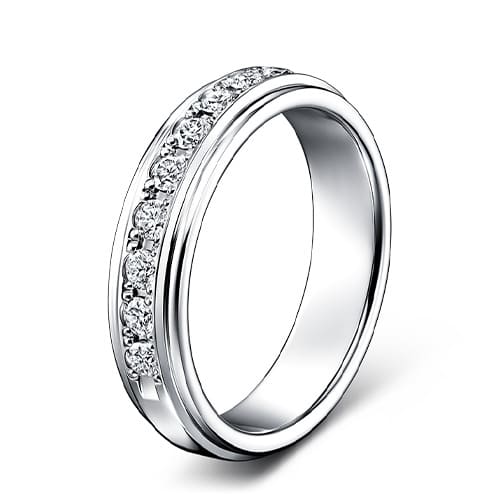 地金の質感が伝わる幅広のデザインで、着ける人の指に主役級の見せ場をつくり出す。堂々たる煌めきを放つメレダイヤモンドはフラットに敷きつめられており、使いやすさにも優れています。丸く柔らかな着け心地も魅力のエタニティリングです。