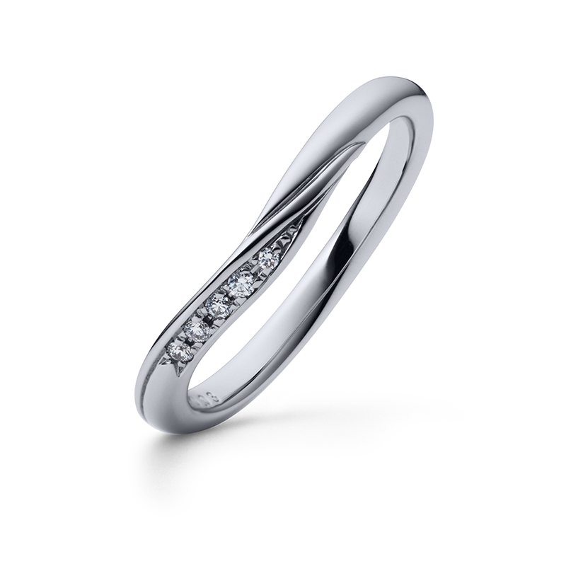 幸せの架け橋をイメージしたVラインは、指をほっそり見せてくれる効果があります。ゆるやかなメレダイヤのラインは、エンゲージリングと重ね着けすると一層美しく、気品に満ちた印象を与えます。