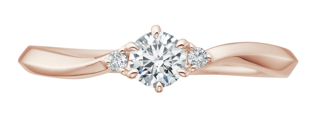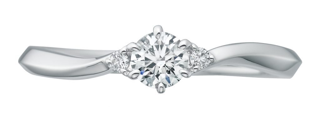 中央に向かう腕のひねりが光を取り込みダイヤモンドとともにリング全体を輝かせます。