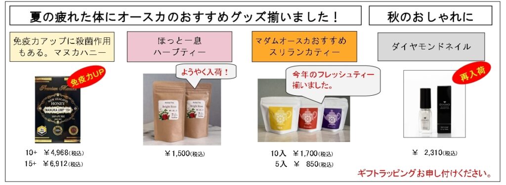 夏の疲れた体にオースカのおすすめグッズ揃いました!<再入荷>秋のおしゃれにダイヤモンドネイル♪