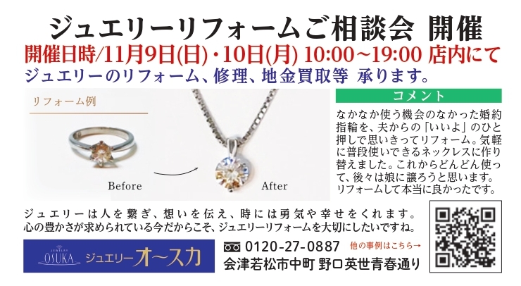 心の豊かさが求められている今だからこそ、ジュエリーリフォームを大切にしたいですね。また地金も40年ぶりの高騰を見せています。今回このチャンスをお見逃しなく。相談は無料です!お気軽にご来店ください!!