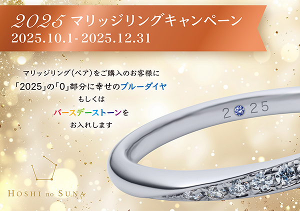 期間中にマリッジリング(ペア)をご購入のお客様に、「2025」の「0」の部分に幸せのブルーダイヤもしくはバースデーストーンをお入れします。
