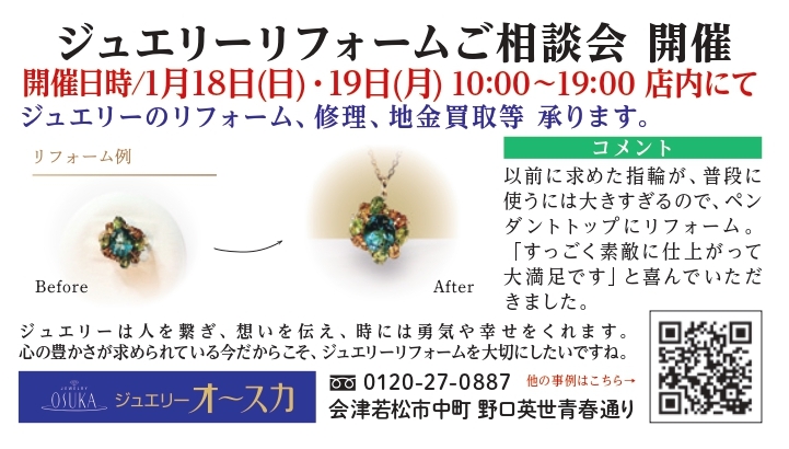 ご自身の宝石をお嬢さんやお孫さんへリフォームしてお譲りしたい方、壊れてしまった愛用のジュエリーを修理したい方、ご家族から譲り受けた思い出の宝石をどのように扱ったらいいかわからないとお悩みの方、ぜひこの機会にご相談ください。